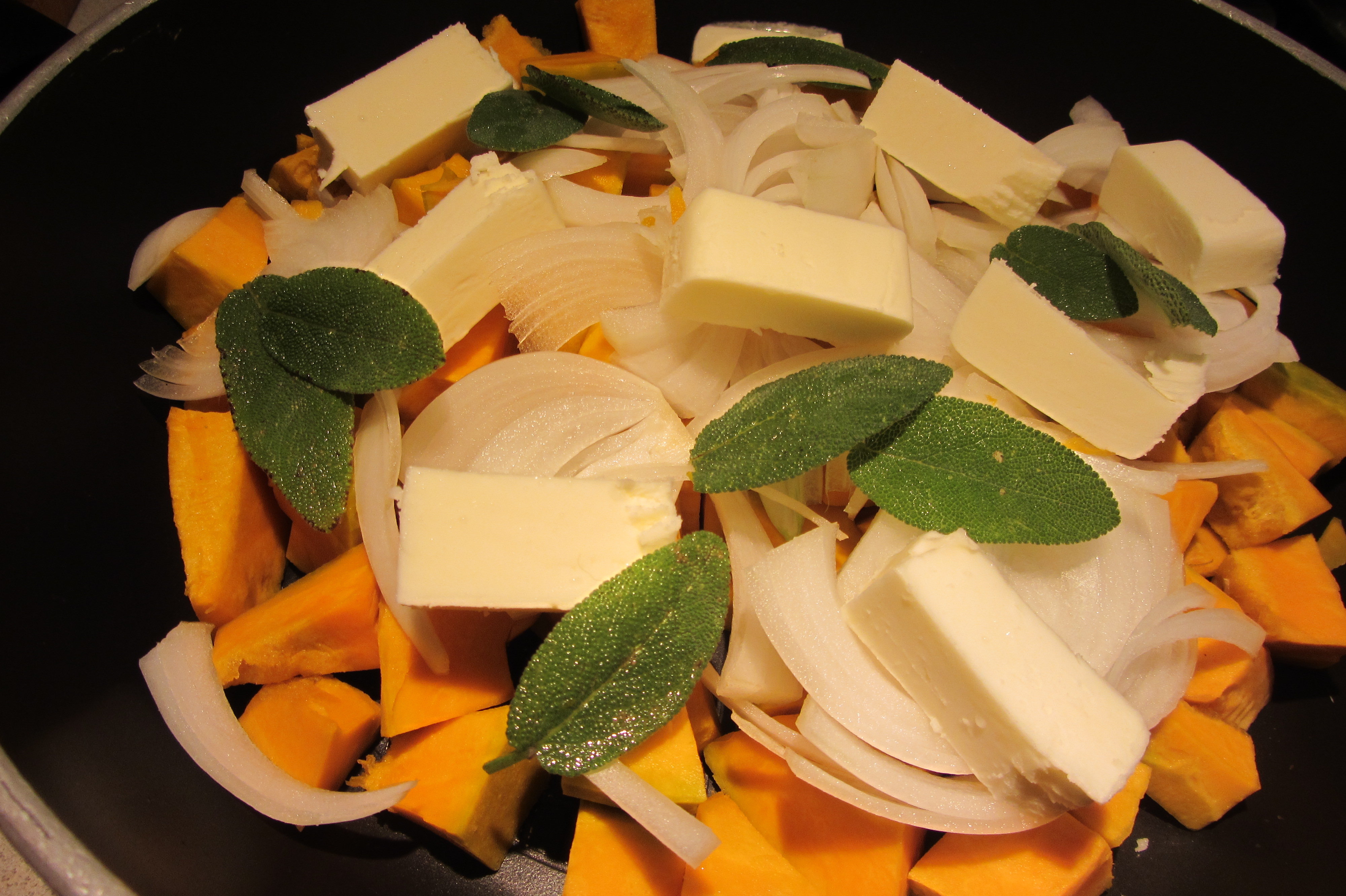 Tagliate a pezzettoni la zucca, a listarelle la cipolla e adagiate il tutto su una padella. Spezzettate il burro e unitelo con le foglie di salvia, un po’ di sale e pepe.