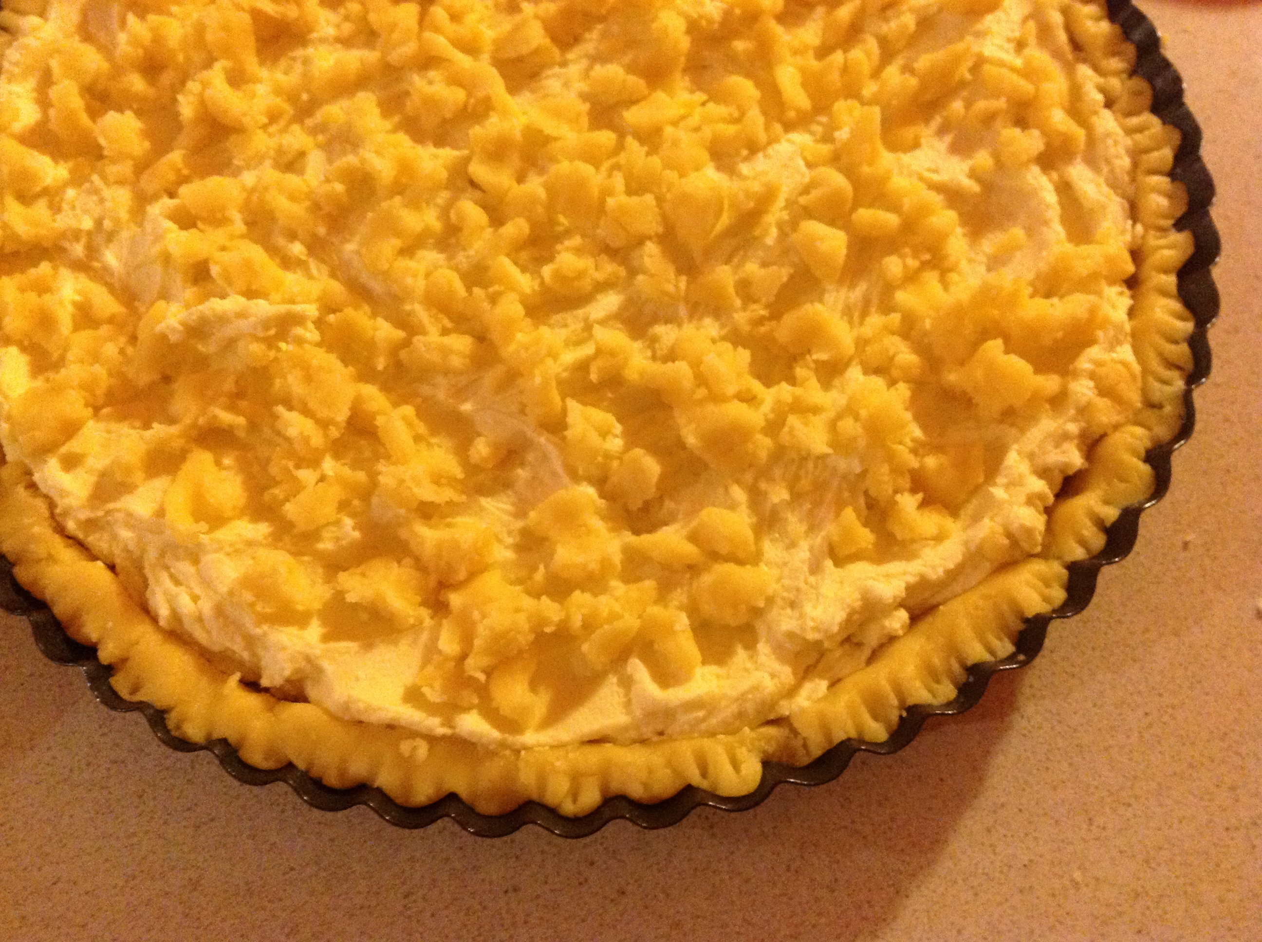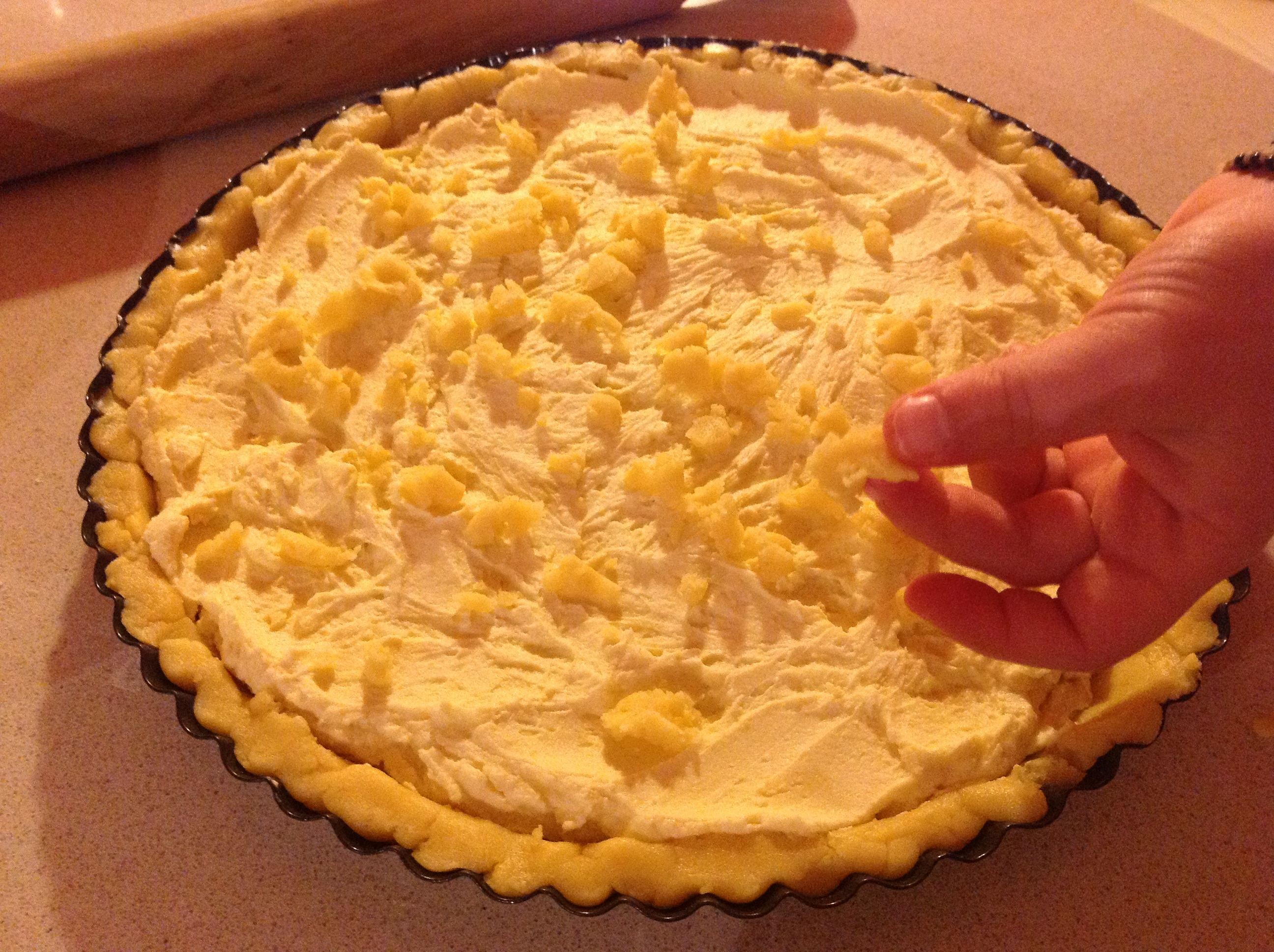 Versate la crema di ricotta, livellate bene e ricoprite con la rimanente pasta frolla spezzettandola con le dita.