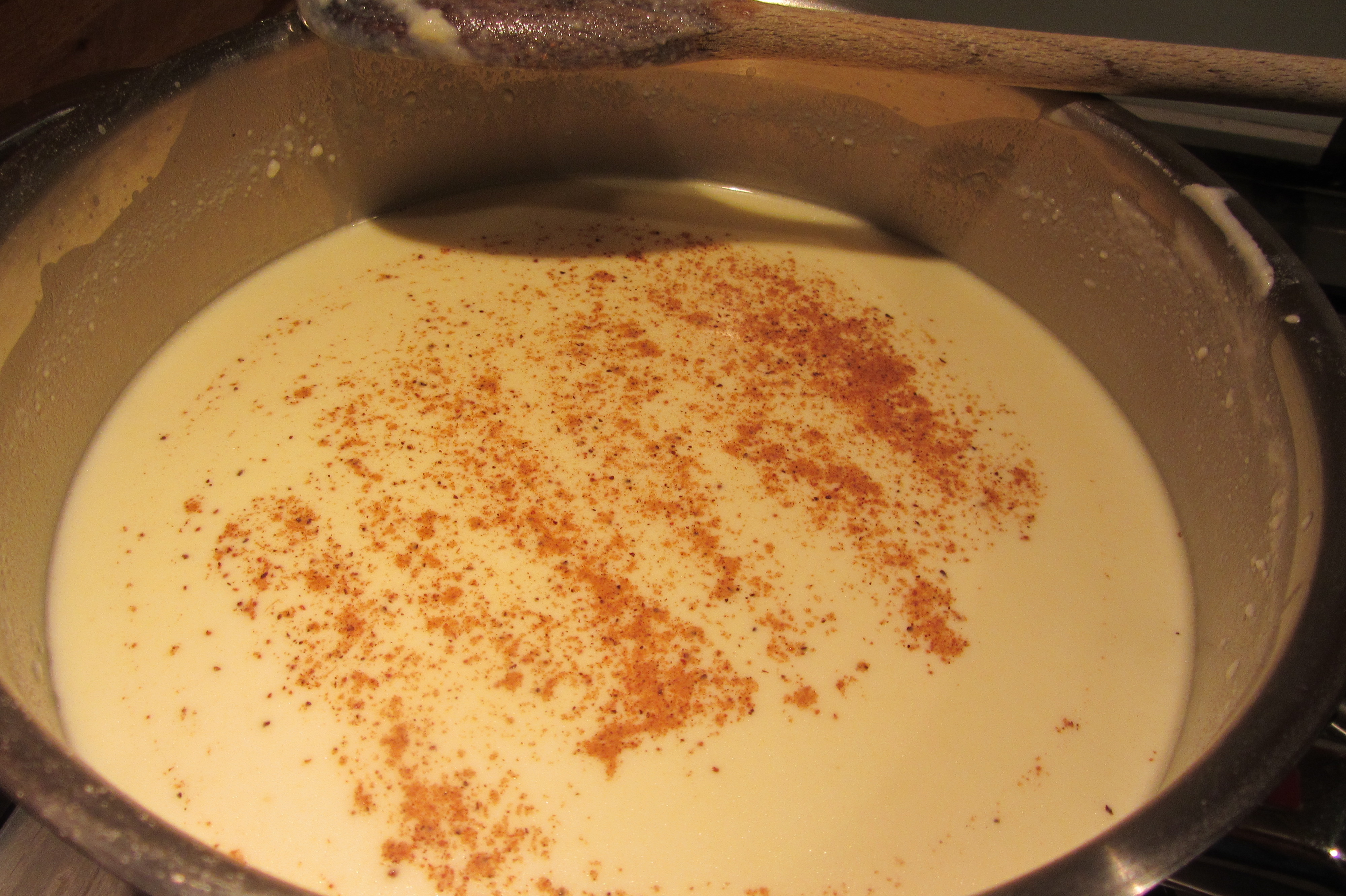 Togliete nuovamente dal fuoco e aggiungete il latte e la noce moscata (a piacere) facendo attenzione a non creare grumi.