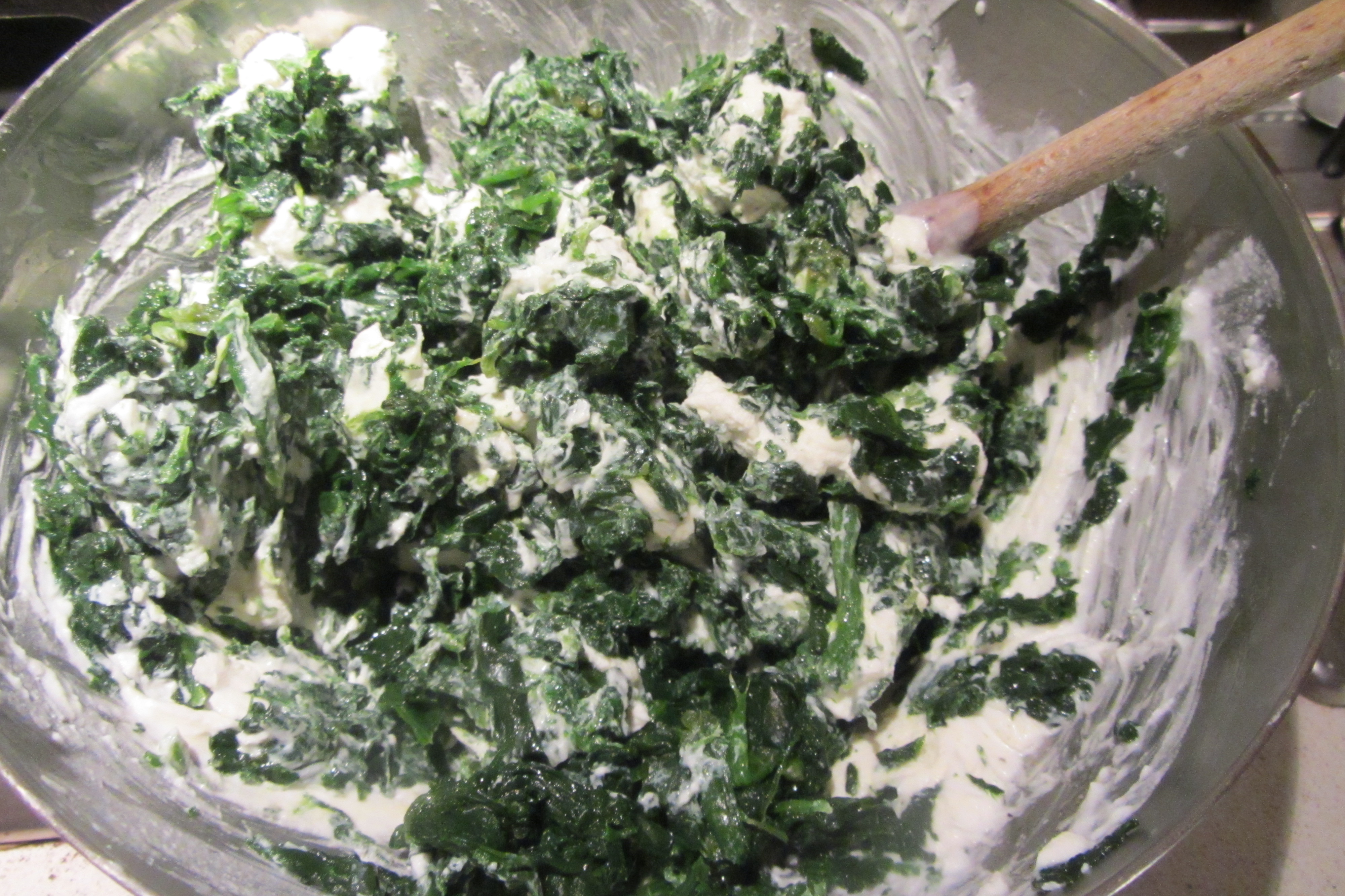 Lavorate la ricotta con una forchetta, aggiungete gli spinaci, un pizzico di pepe e regolate di sale.