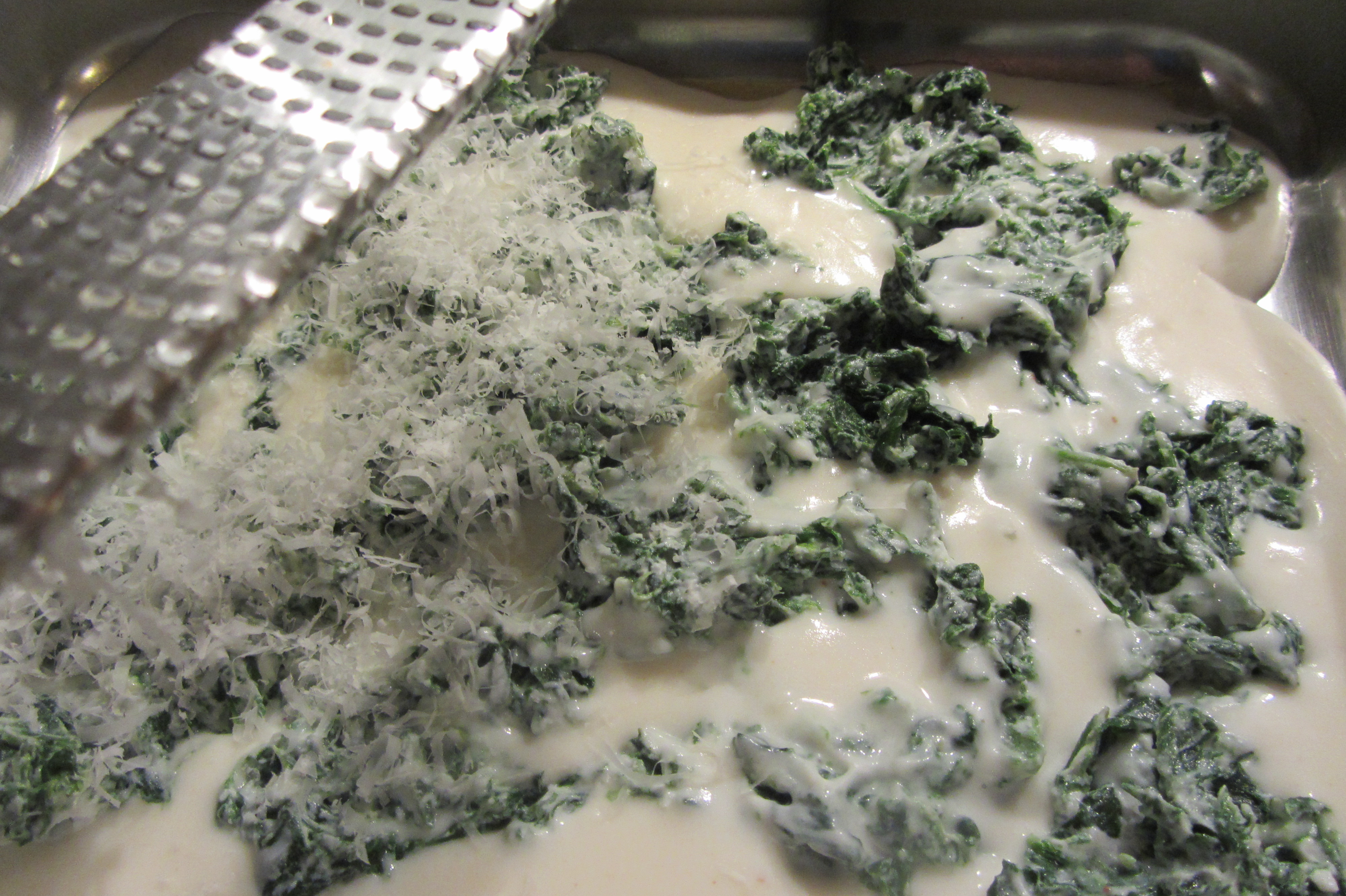 Adagiate una lasagna sulla pirofila, ricopritela con la besciamella, qualche cucchiaiata di ricotta e spinaci e una grattugiata di parmigiano.