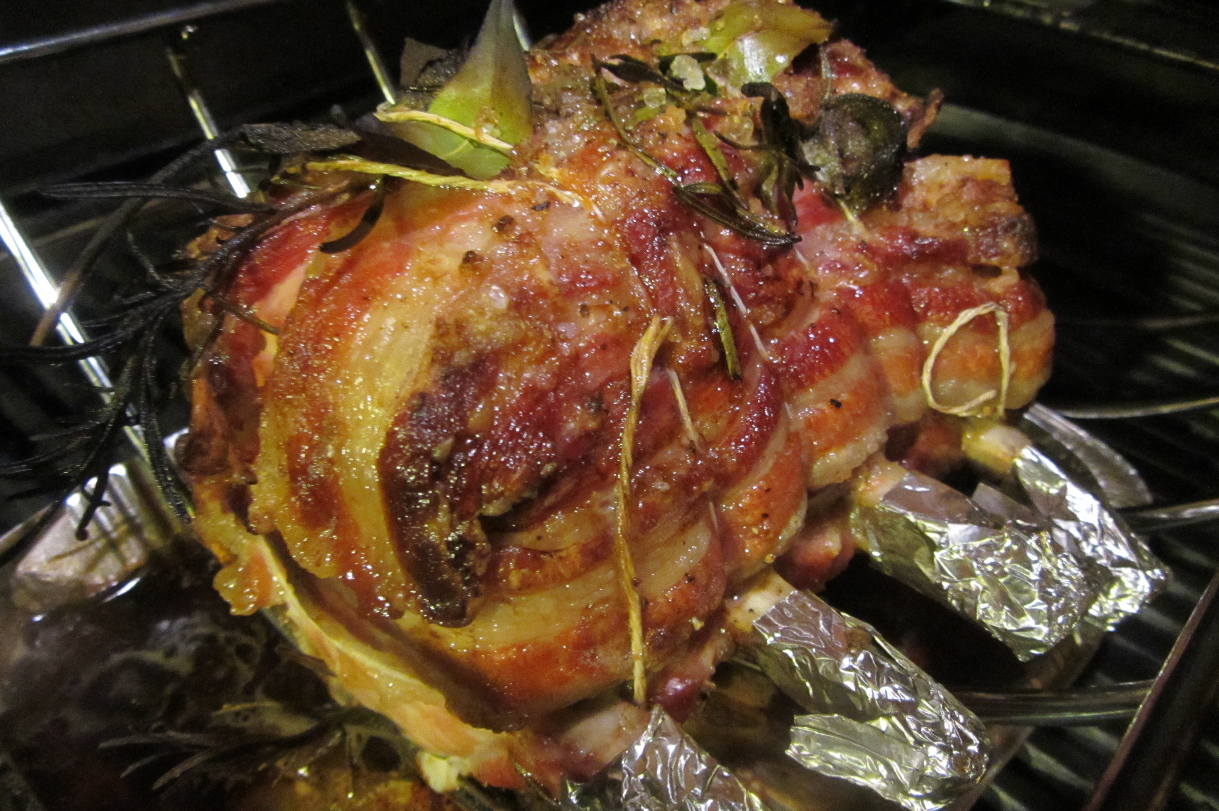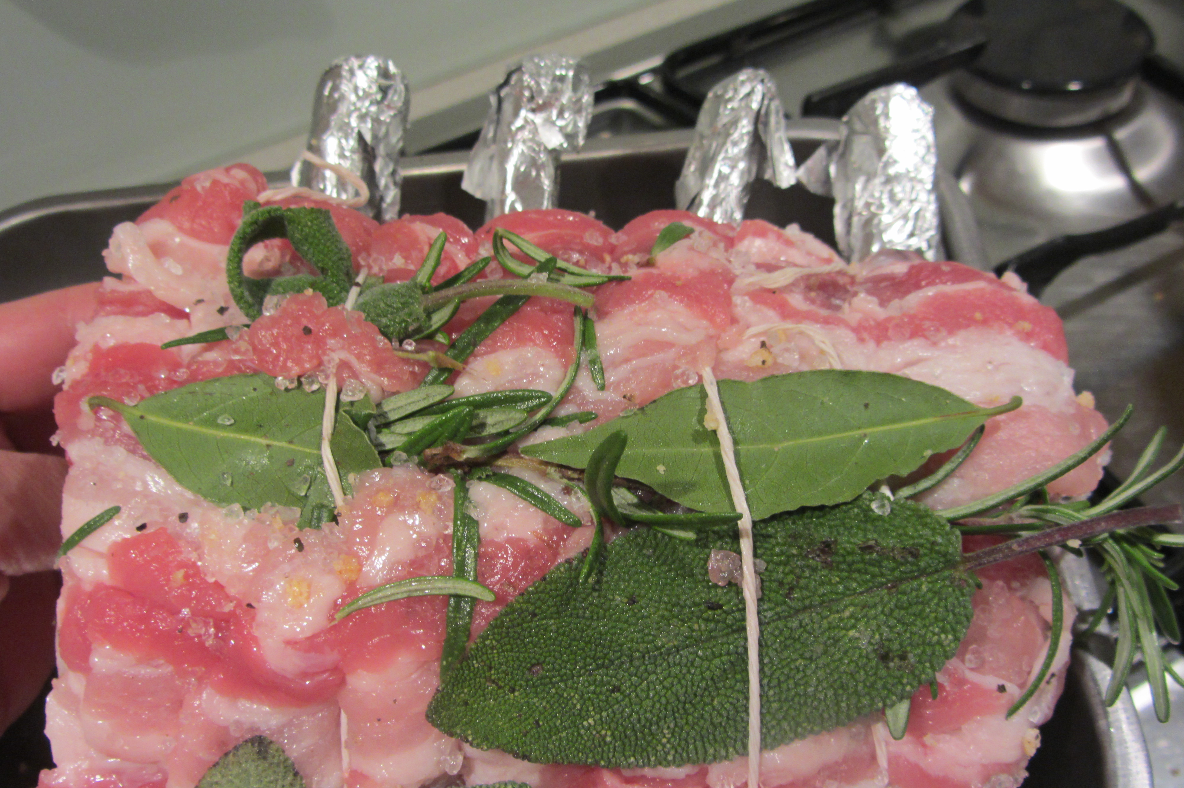 Innanzitutto si deve avvolgere l’arista con le fette di pancetta per poi legarla con del filo da cucina (in questo caso lo aveva fatto il mio macellaio number one!!!).