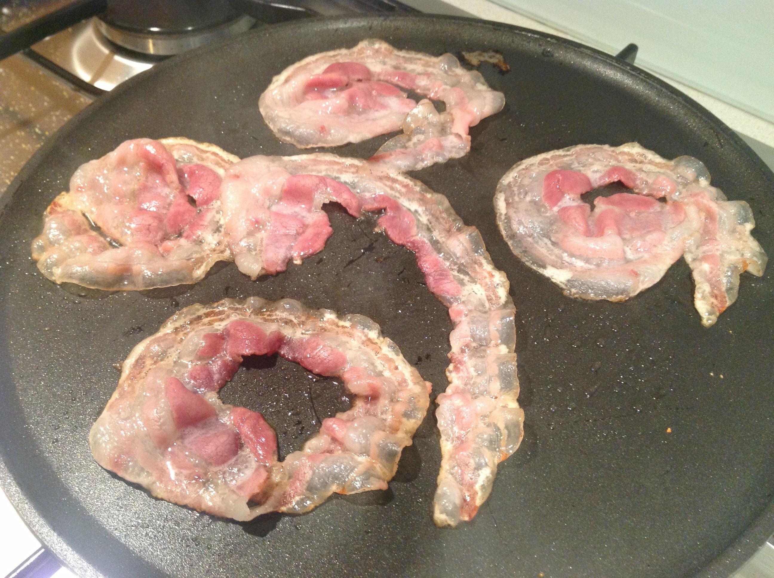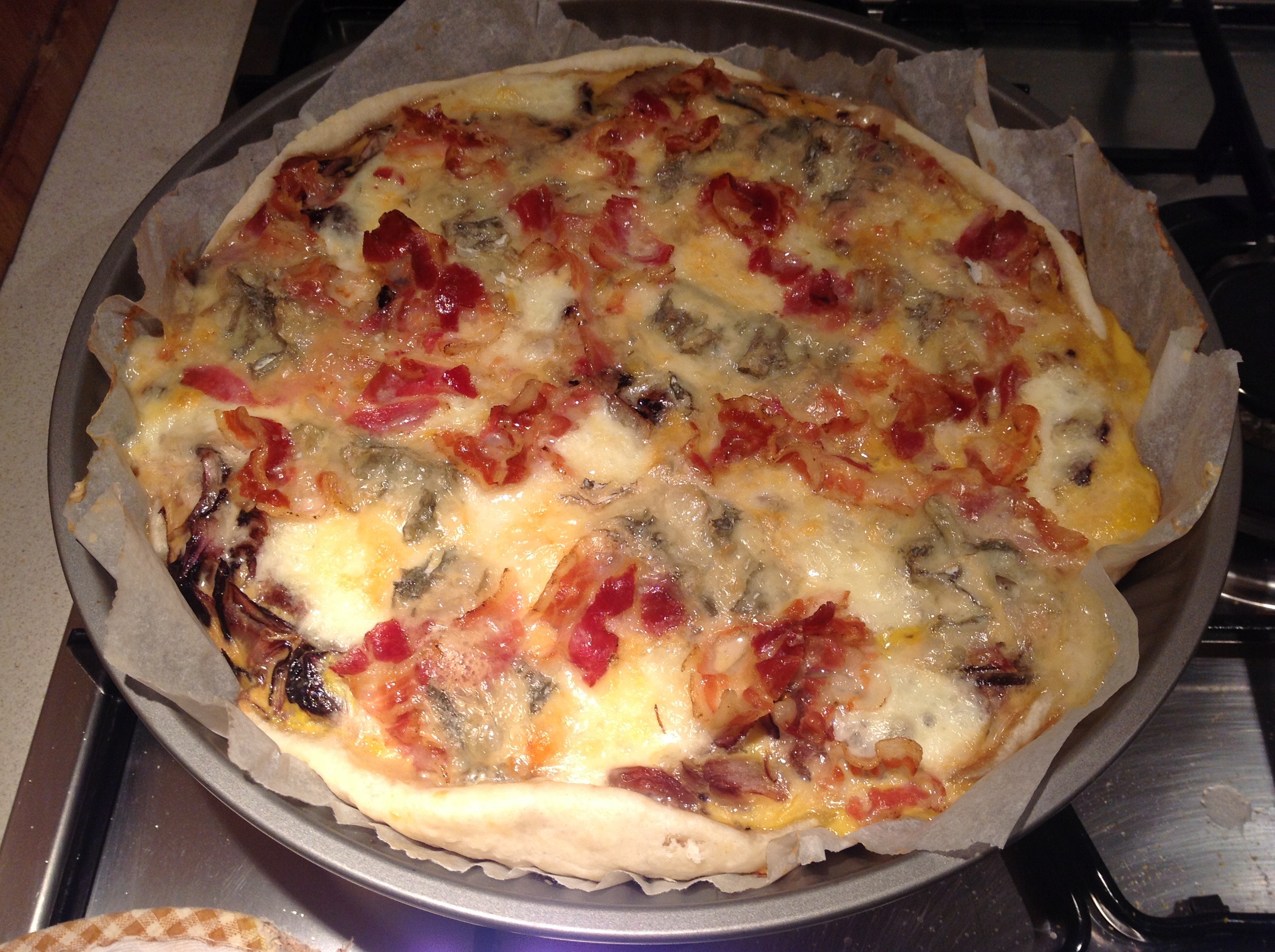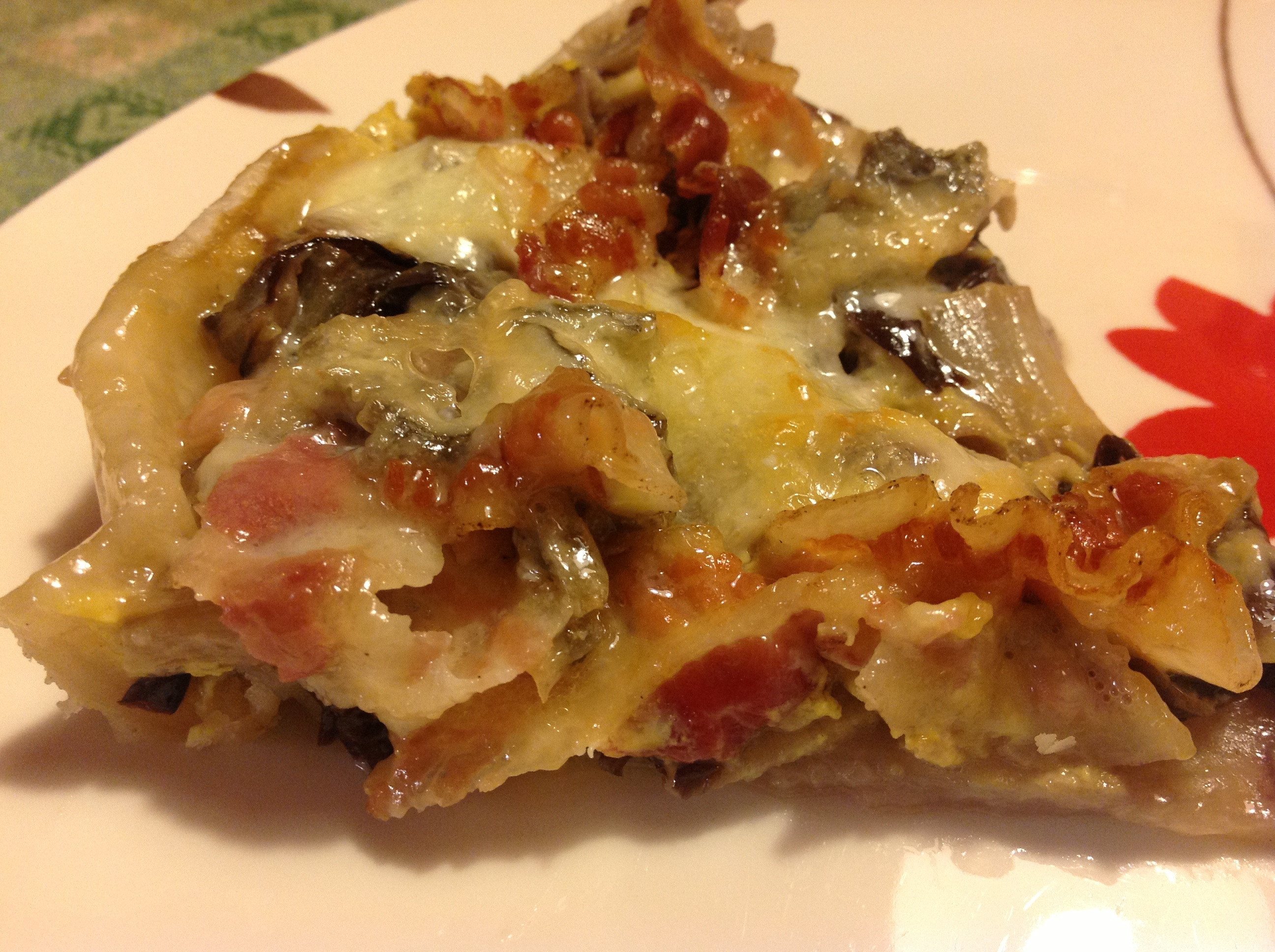 Versate il radicchio sulla base, quindi distribuite la mozzarella a fette, la pancetta tagliata a pezzetti e per ultimo il gorgonzola a tocchetti.
