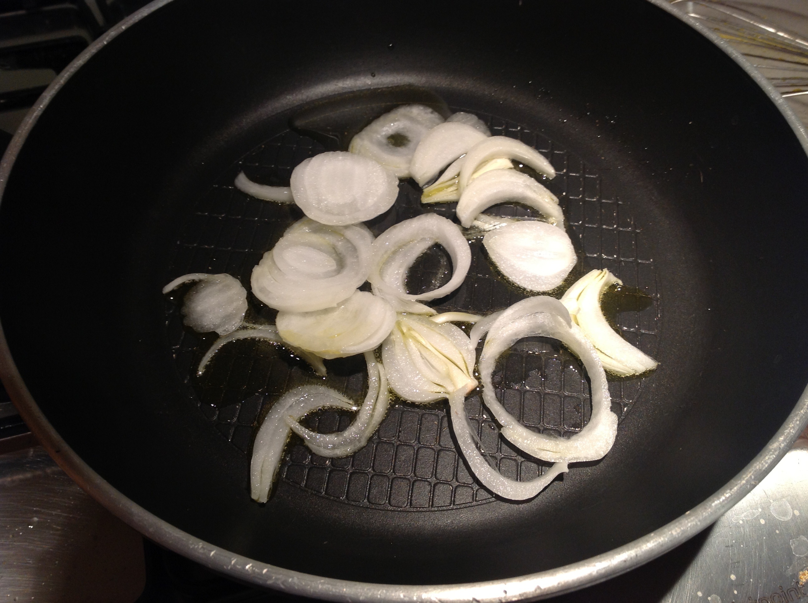 Nel frattempo preparate il ripieno. Mettete ad appassire in una padella con olio evo mezza cipolla tagliata a fettine sottili.