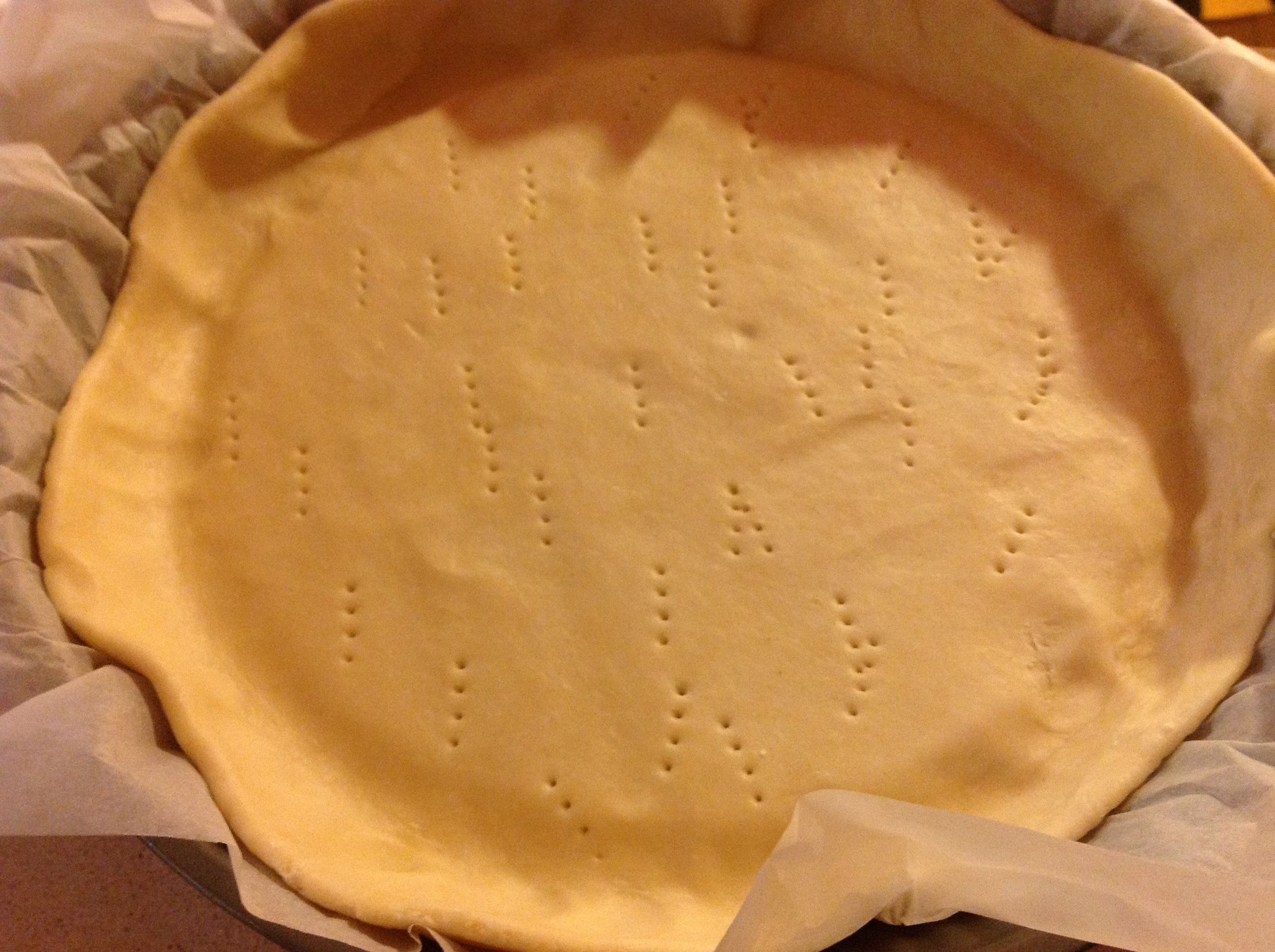 Stendete la pasta brisè su una tortiera foderata di carta da forno e bucherellate il fondo con una forchetta.