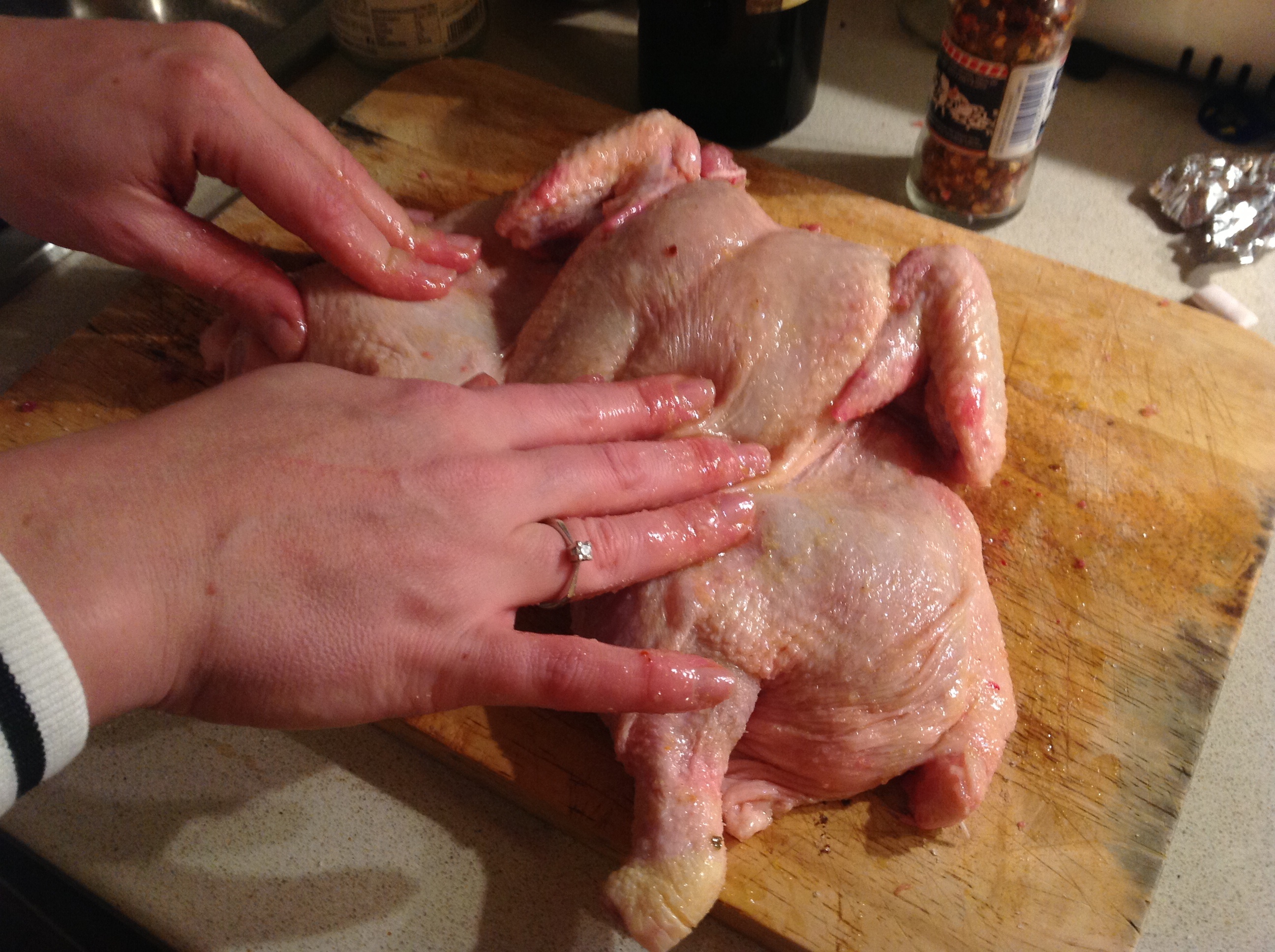 Massaggiate il pollo prima con il sale fino e poi con un po’ dell’olio al peperoncino.