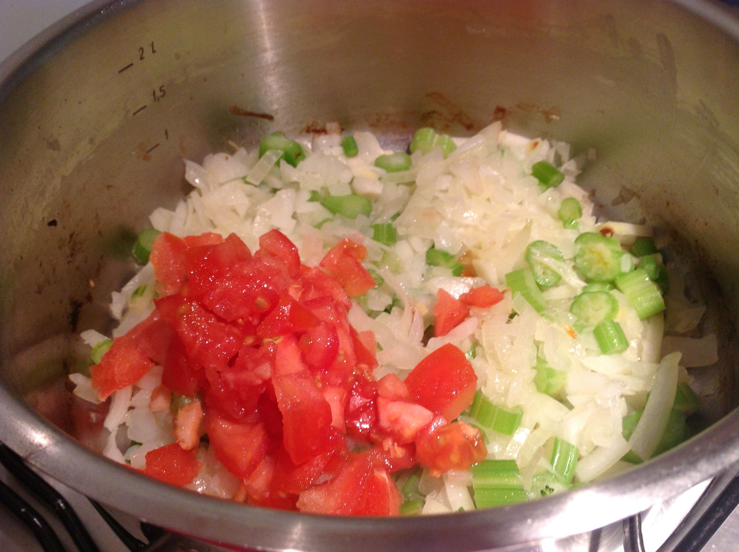 Mettete a soffriggere con un cucchiaio di olio e due cucchiai di acqua la cipolla con il sedano. Dopo un paio di minuti aggiungete il pomodoro a pezzettoni.