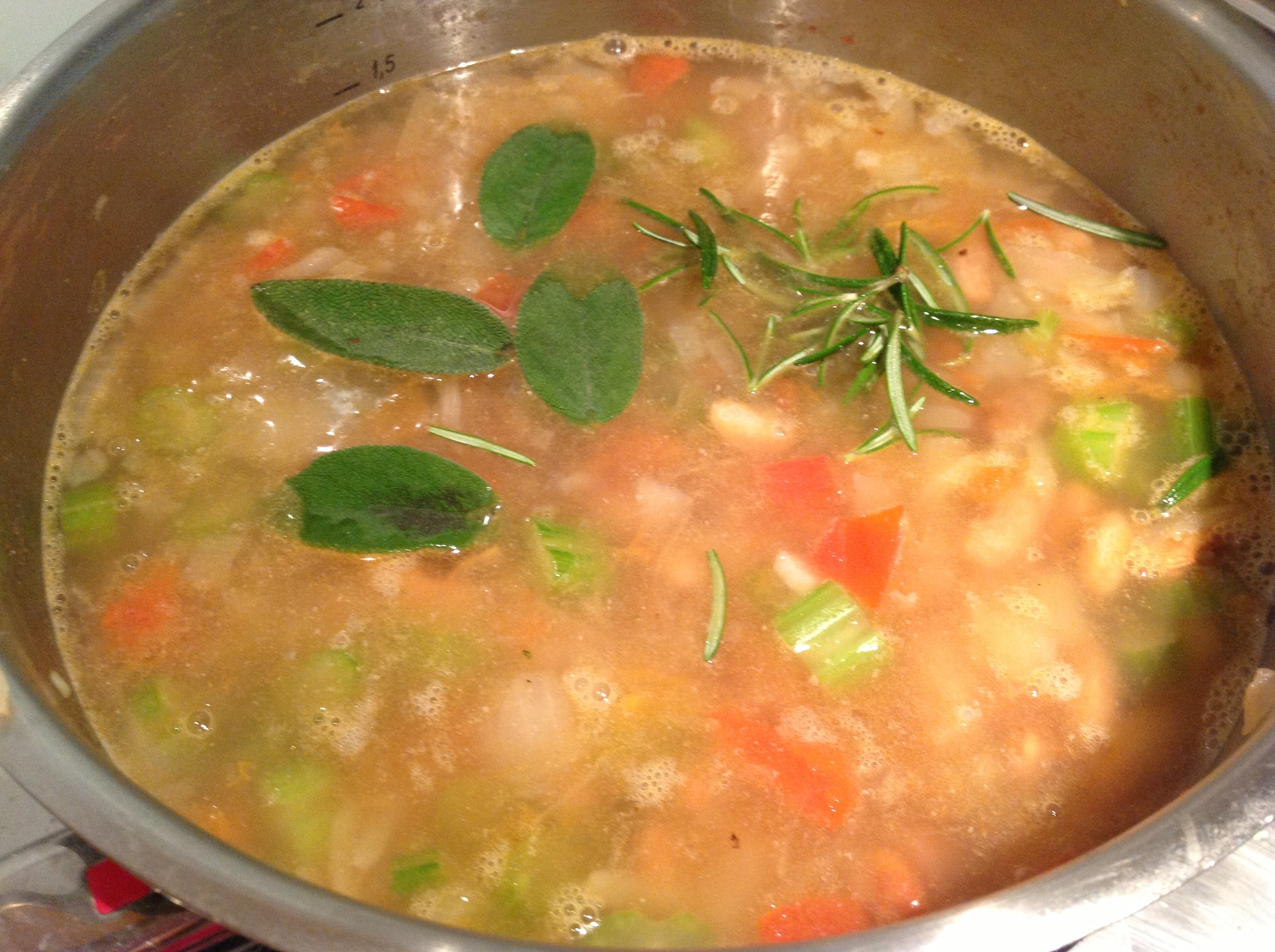 Aggiungete i fagioli, fate insaporire per un paio di minuti, quindi versate un litro di acqua. Aggiungete la salvia e il rosmarino, aggiustate di sale e pepe e lasciate sobbollire per circa mezz’ora.