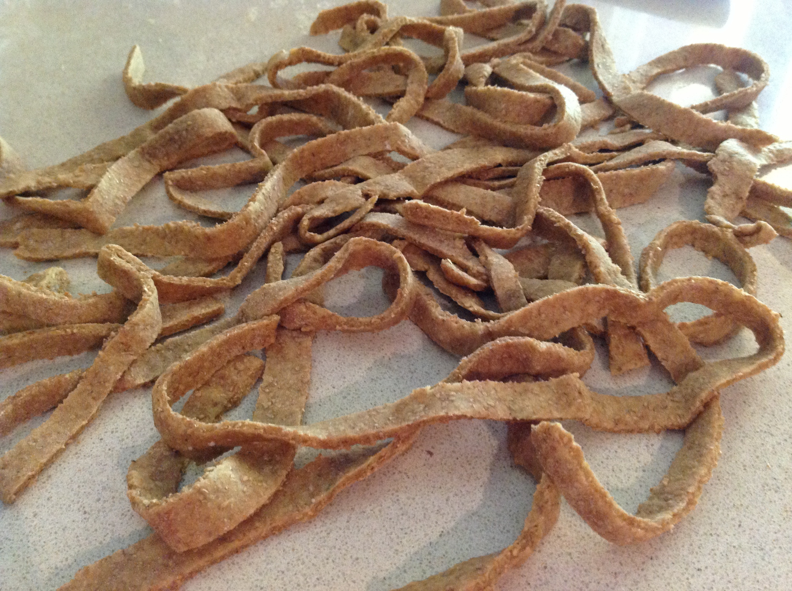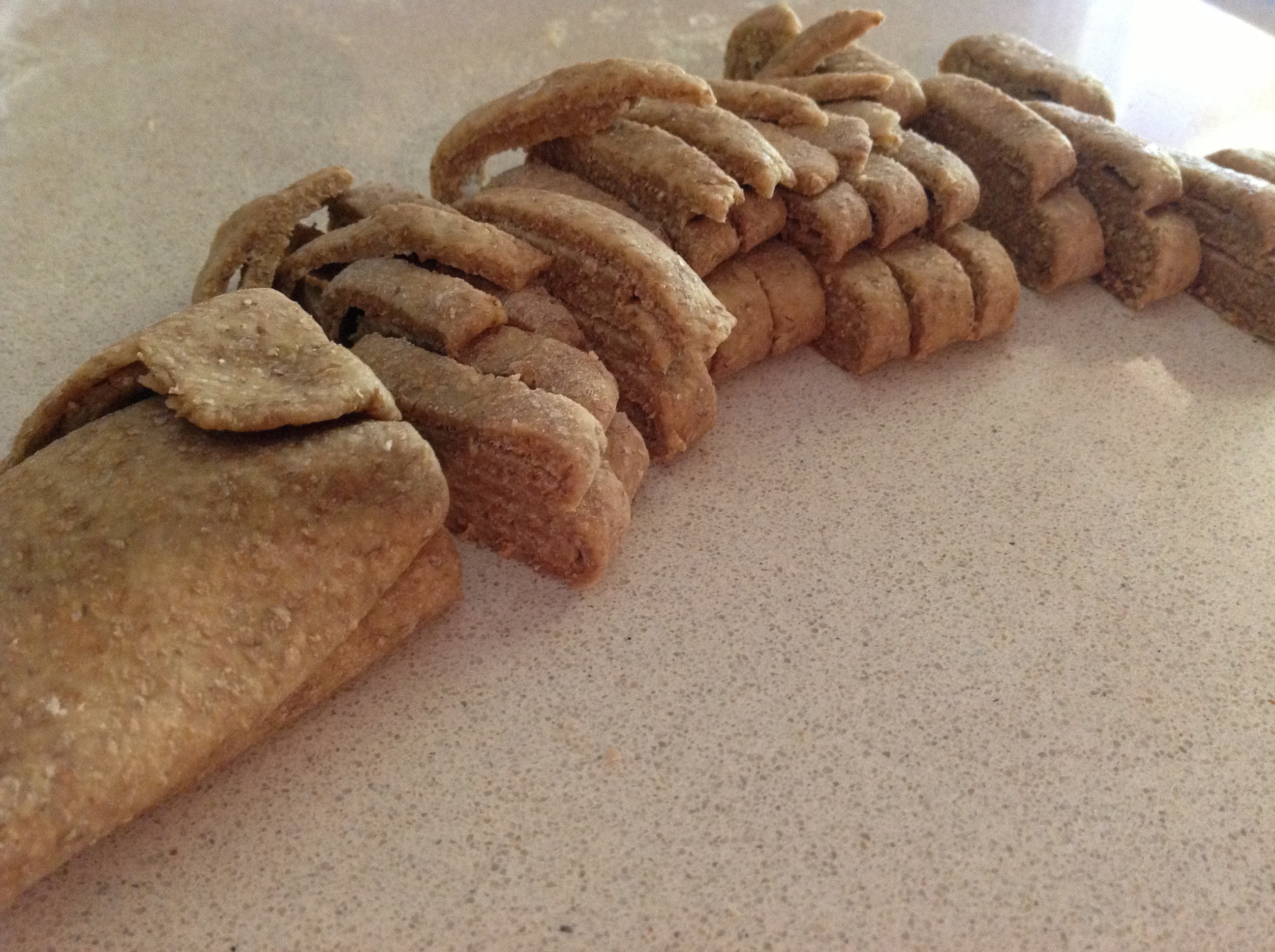 Ora é il momento di tagliare la pasta: tirate una sfoglia non troppo sottile, arrotolatela e tagliate a fettine per creare delle tagliatelle “rustiche”.