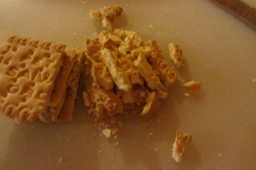 Sminuzzate i biscotti grossolanamente (vi consiglio di usare un coltello e tagliarli “a strisce”, in questo modo saranno visibili nelle fette).