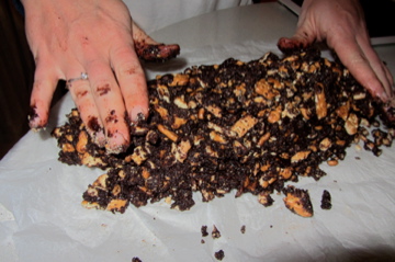 Amalgamate la crema con i biscotti, quindi adagiate l’impasto in un foglio di carta da forno bagnato e ben strizzato.