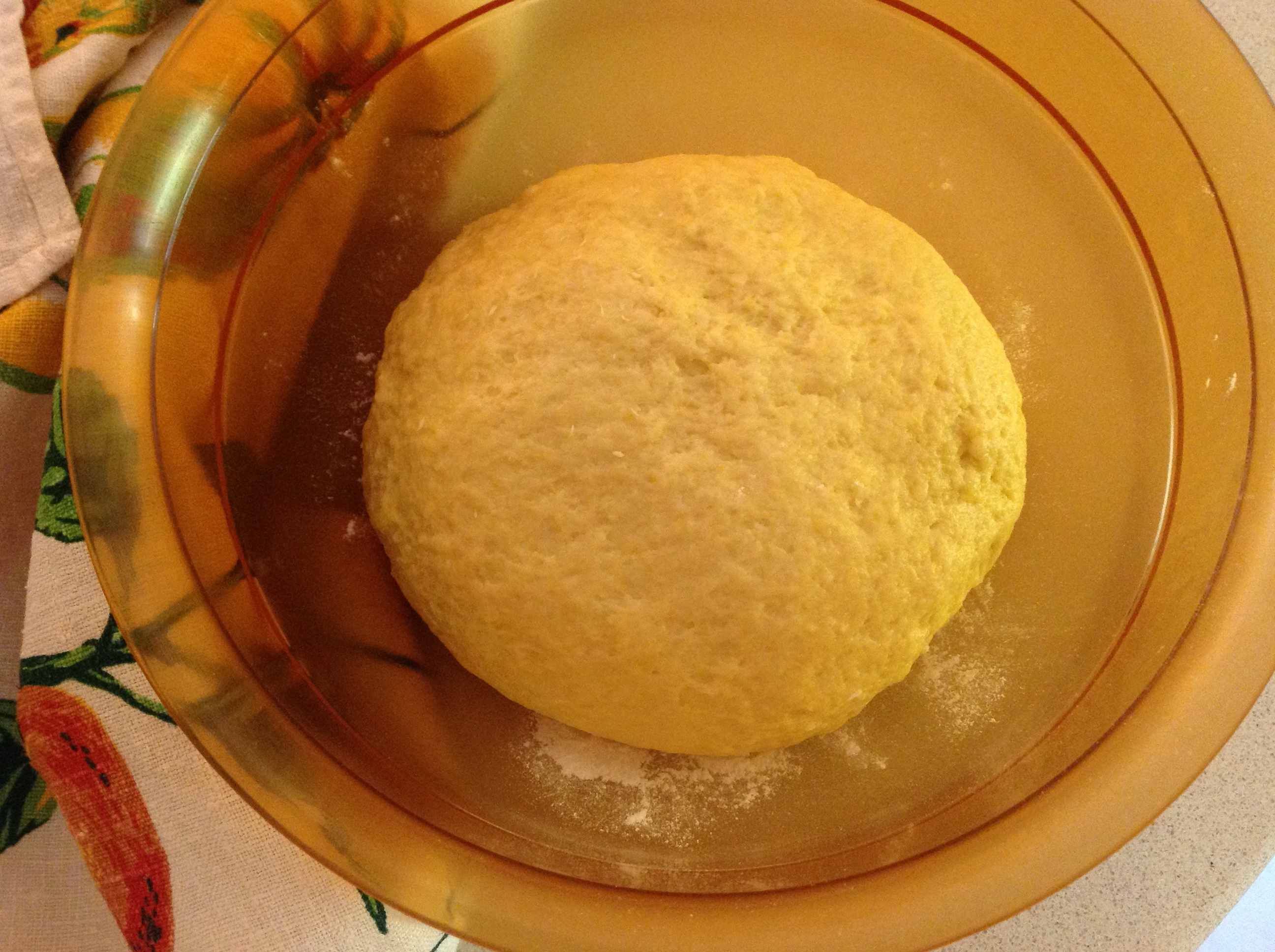 Fate una bella palla e ponete a lievitare in forno caldo ma spento, coperto da un canovaccio umido, per un’ora.