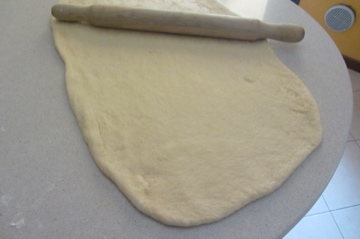 Quando l’impasto sarà raddoppiato, lavoratelo ancora un po’ e stendetelo con un mattarello per formare un rettangolo di circa 1 cm di spessore.