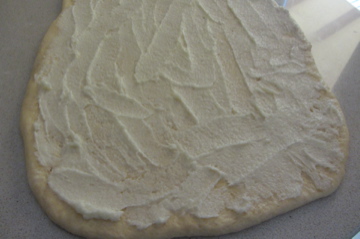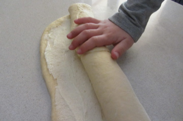 Spalmate la crema di burro sulla pasta e arrotolate per formare un lungo cilindro.