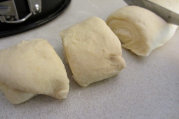 Tagliate il rotolo ogni 5 cm per ottenere le rose, che andrete a posizionare, distanti tra loro circa 1 cm, in una tortiera imburrata e infarinata o rivestita con carta da forno (bagnata e strizzata).