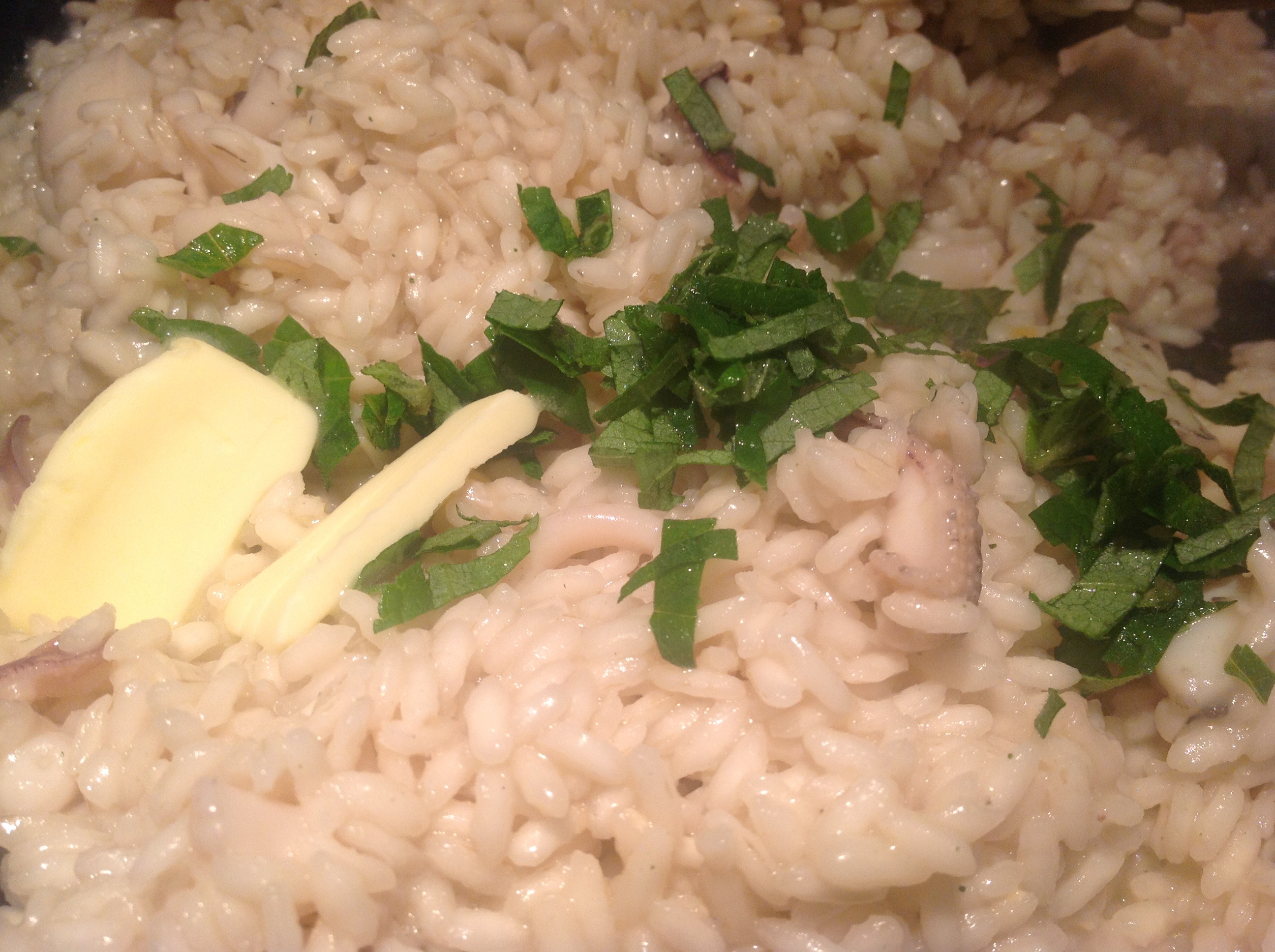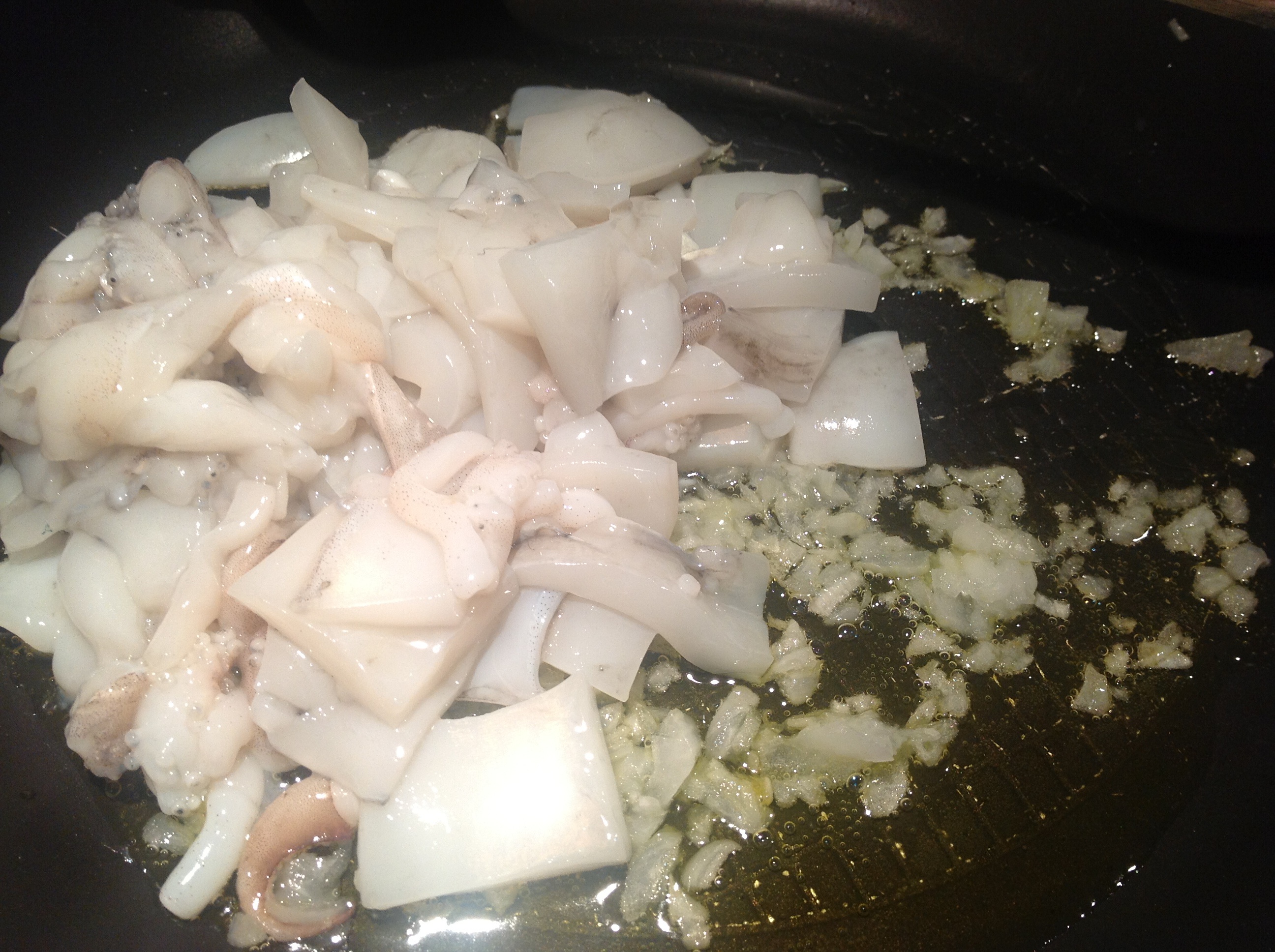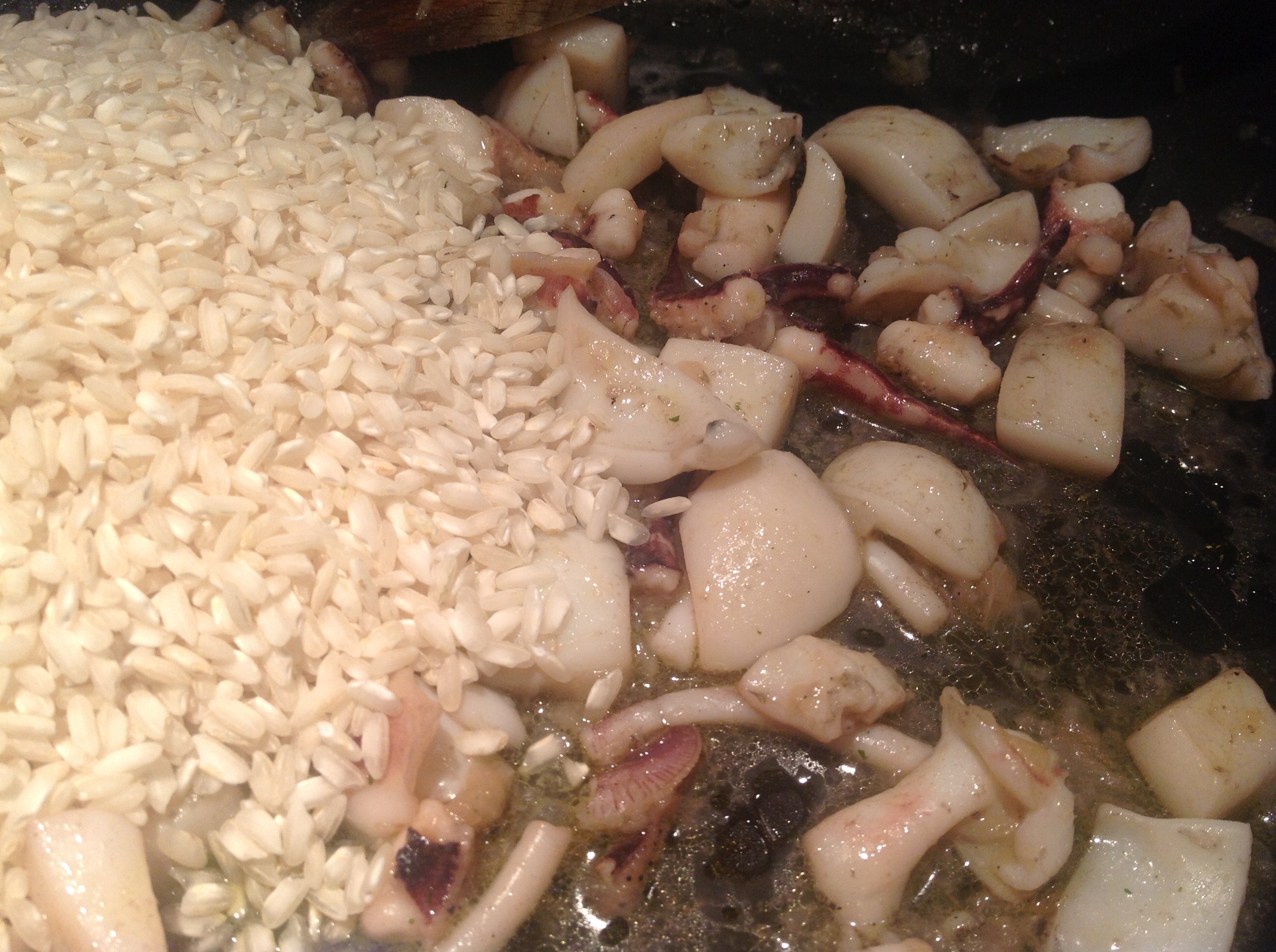 Aggiungete le seppie, fate rosolare, quindi irrorate con un mestolo di brodo caldo e continuate la cottura.