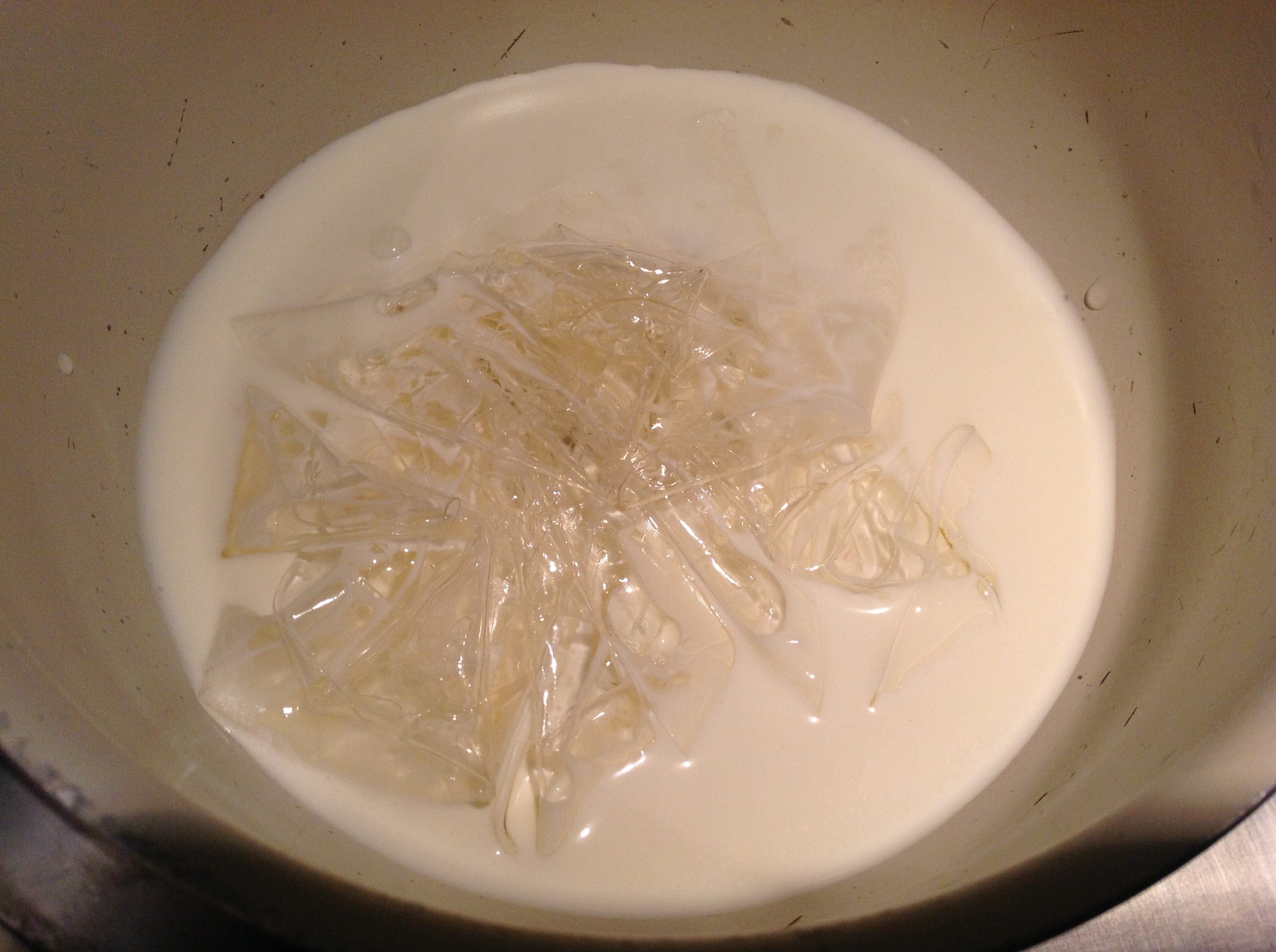Nel frattempo mettete la colla di pesce in ammollo in acqua fredda per circa 10 minuti, ovvero fino a quando sarà ammorbidita. Strizzate i fogli e scioglieteli in 3 cucchiai di panna, in un pentolino, a fuoco dolce.
