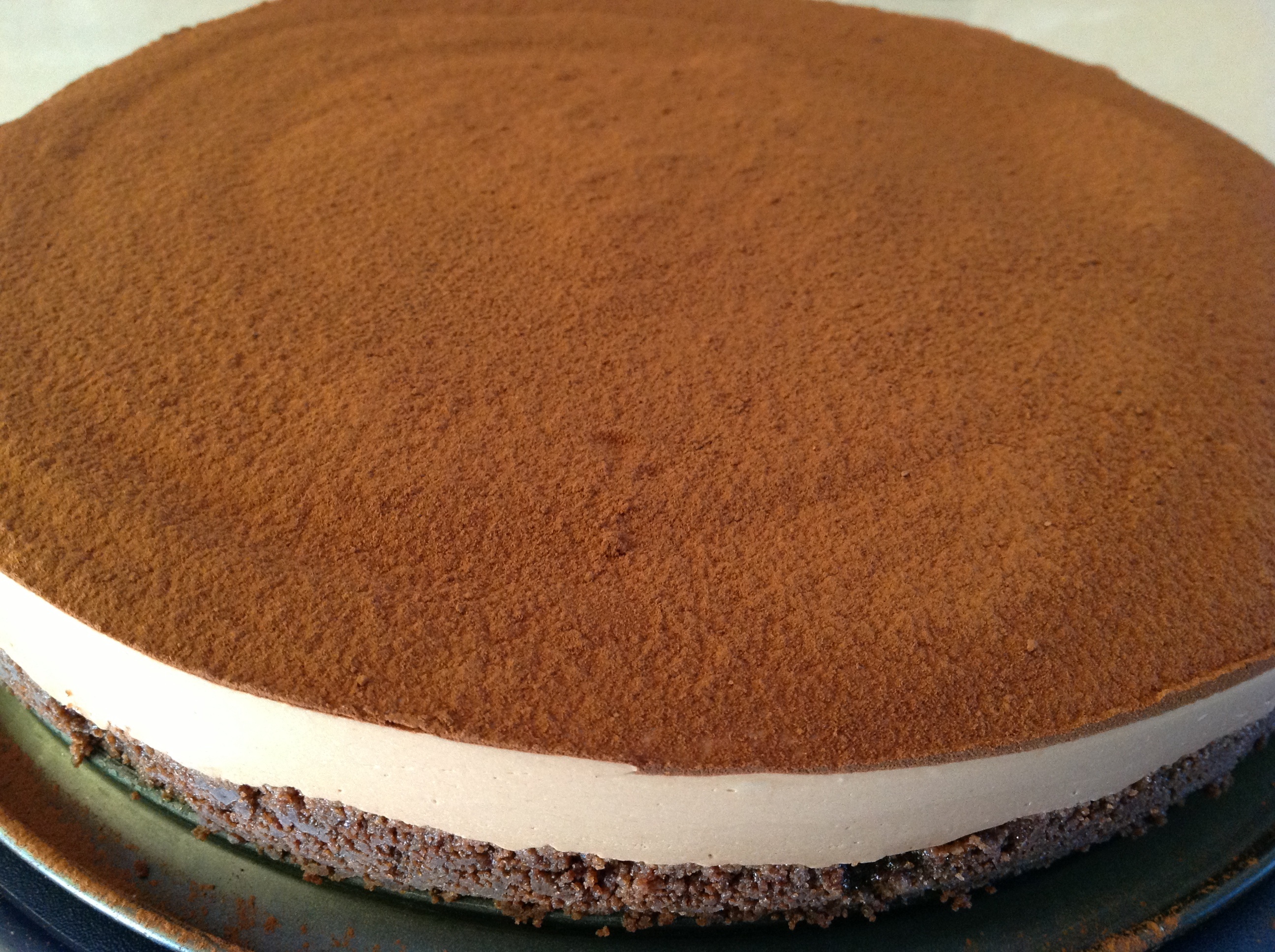 Versate l’impasto nel fondo di una tortiera con cerco apribile e premetelo bene per creare un fondo compatto. Ponete la tortiera in frigorifero. Montate il formaggio con lo zucchero, quindi aggiungete il cioccolato fuso a bagnomaria o al microonde.