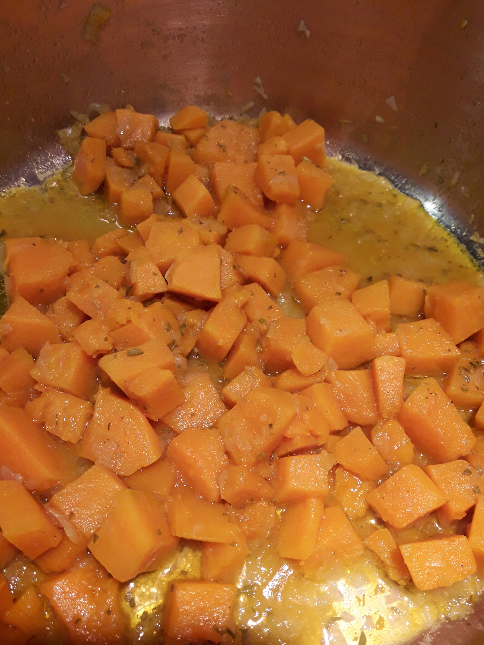 Mettete a soffriggere la cipolla, aggiungete la zucca e il rosmarino, fate rosolare qualche istante, quindi aggiungete un po’ di brodo e lasciate cuocere per circa 10 minuti.
