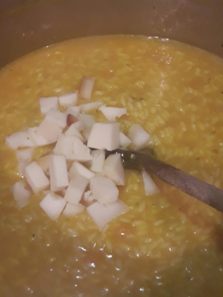Quando la zucca è tenera aggiungete il riso, fate asciugare e quindi procedete come un qualsiasi risotto, mescolando di continuo, aggiungendo brodo quando serve e regolando di sale e pepe.