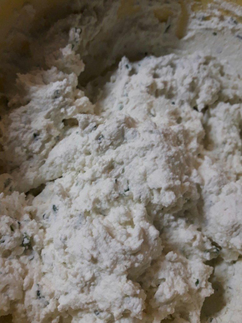 Preparate il ripieno: sminuzzate alcune foglie di basilico e di erba cipollina e mescolatele alla ricotta. La quantità di erbe è a piacere: potete anche aggiungere altre erbe aromatiche, come il timo o l’origano. Aggiustate di sale e pepe.