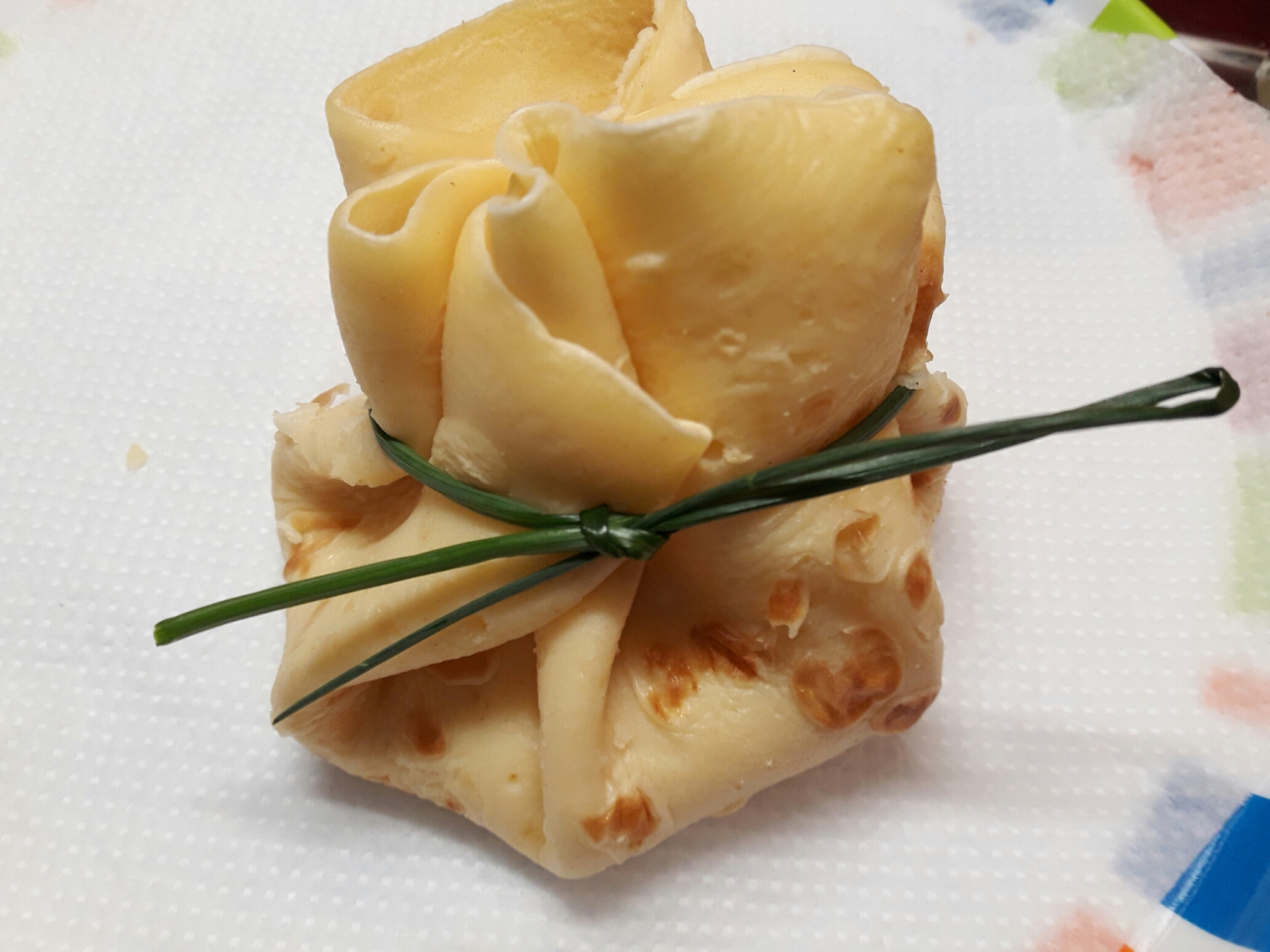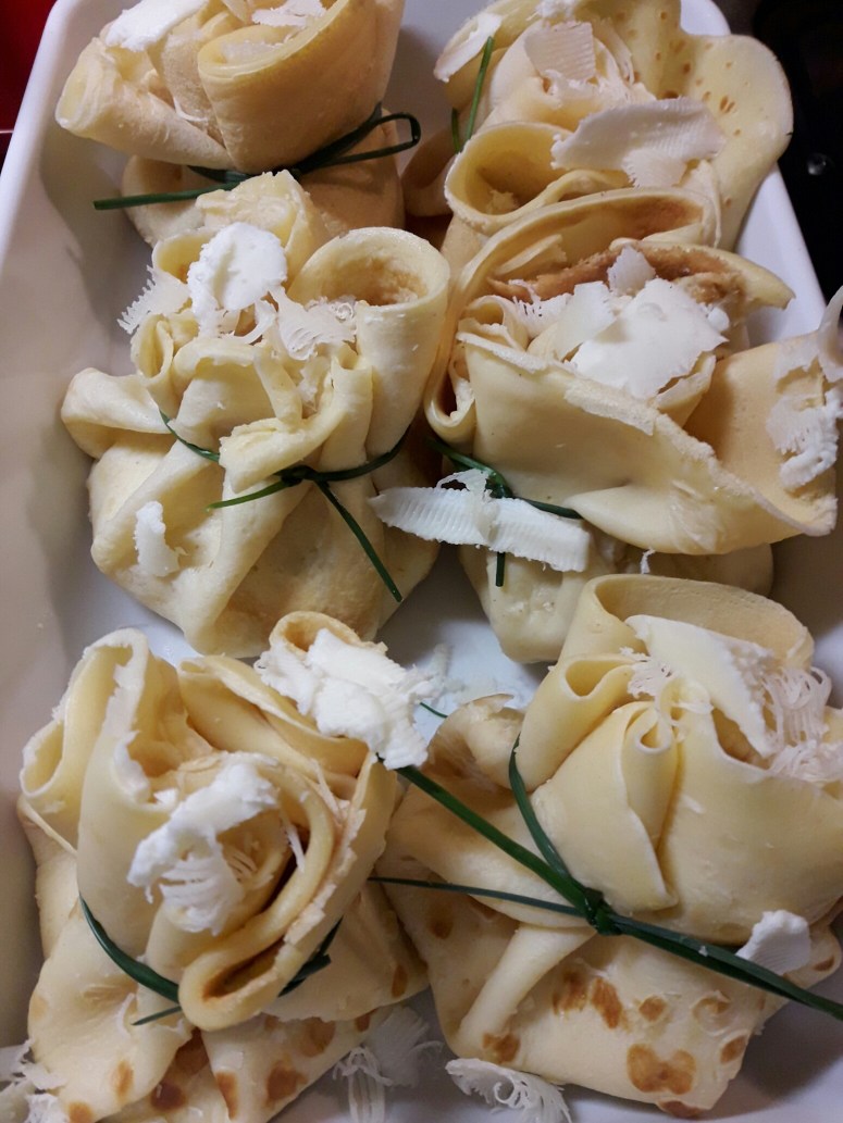Quando si sono raffreddate, riempite le crespelle con una cucchiata abbondante di ripieno e legatele, a mo’ di sacchettino, con una foglia di erba cipollina.