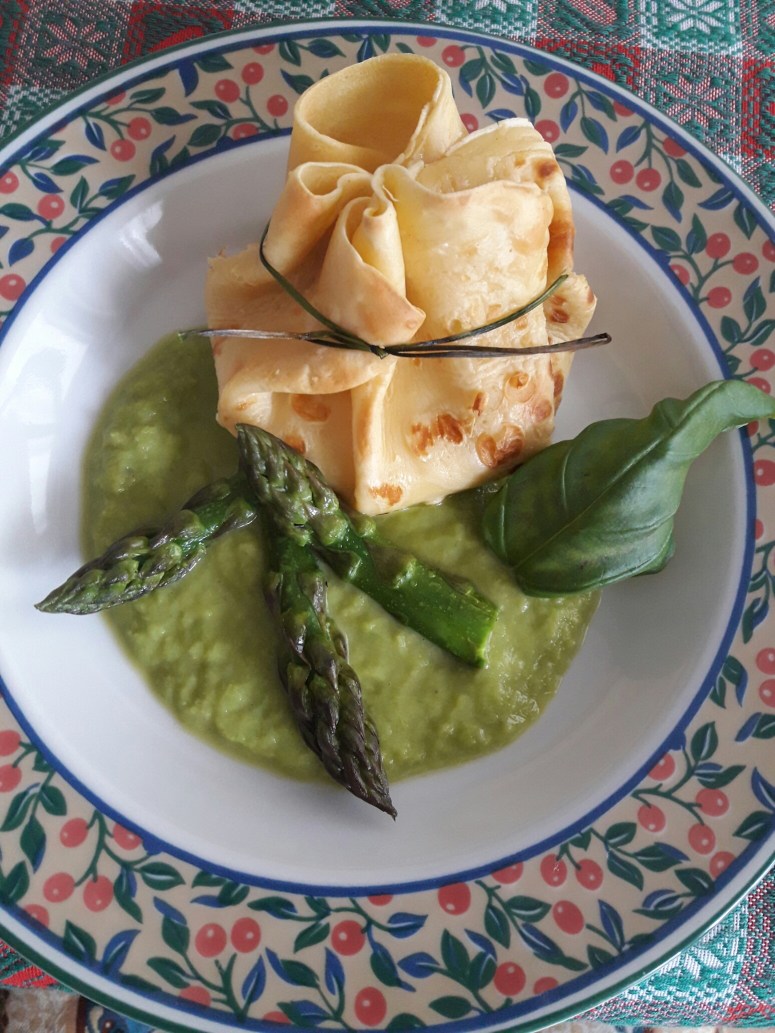 Ora non vi resta che impiattare: nel fondo la crema di asparagi, da una parte il fagottino e infine le punte per decorare.