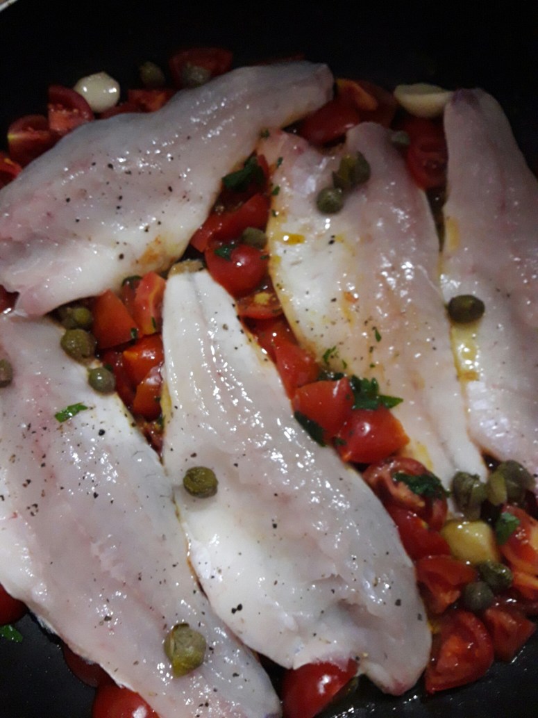 Adagiate i filetti di branzino dalla parte della pelle, salate e pepate, quindi aggiungete i capperi (anche olive nere se vi piacciono).