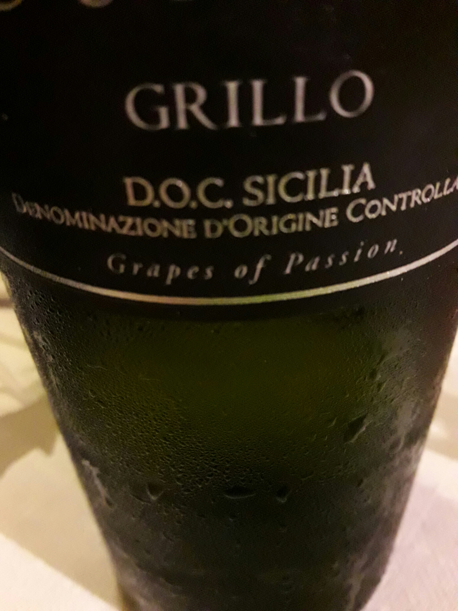 Il vino che abbiamo provato e che ben si abbina è prodotto a Marsala, da un vitigno autoctono “il Grillo”.