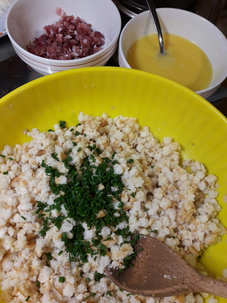 Tagliate a dadini lo speck e finemente l’erba cipollina; sbattete le uova per ottenere un composto omogeneo. Unite tutto al pane, compreso l’Asiago e il grana; aggiungete la farina, salate e mescolate bene.