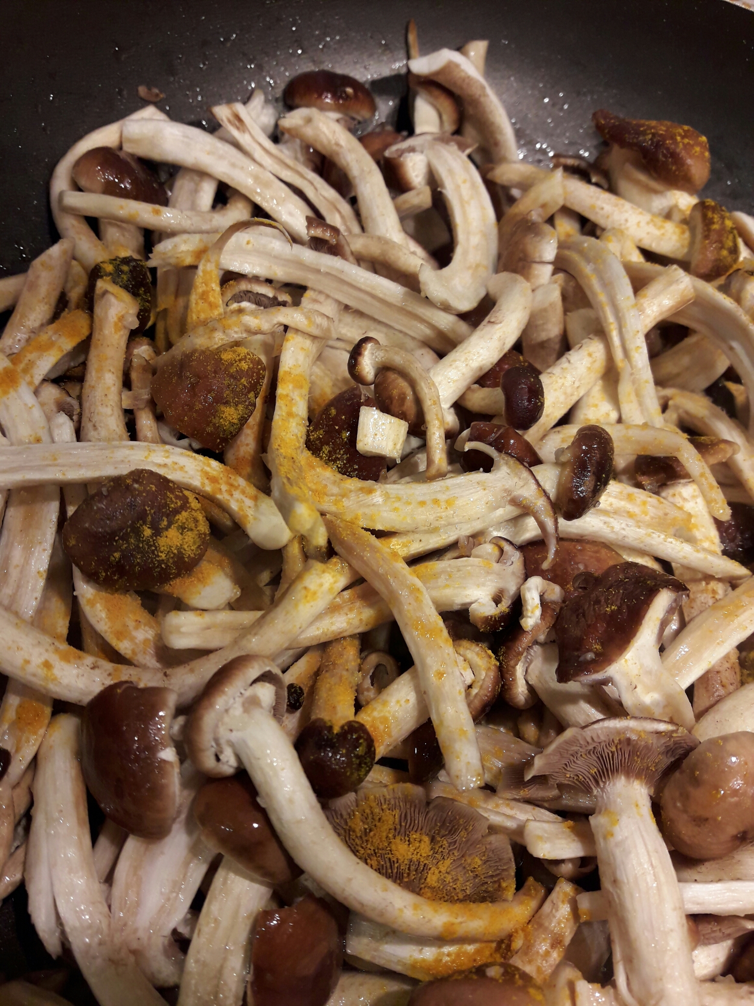 Tagliate solo i più grandi, per il lungo… almeno, a noi piacciono così! Sminuzzate l’aglio e fatelo soffriggere nell’olio evo, quindi aggiungete i funghi e fateli appassire un po’. Salate, pepate e spolverare con la curcuma: se serve bagnate con dell’acqua o brodo vegetale e lasciate cuocere coperti.