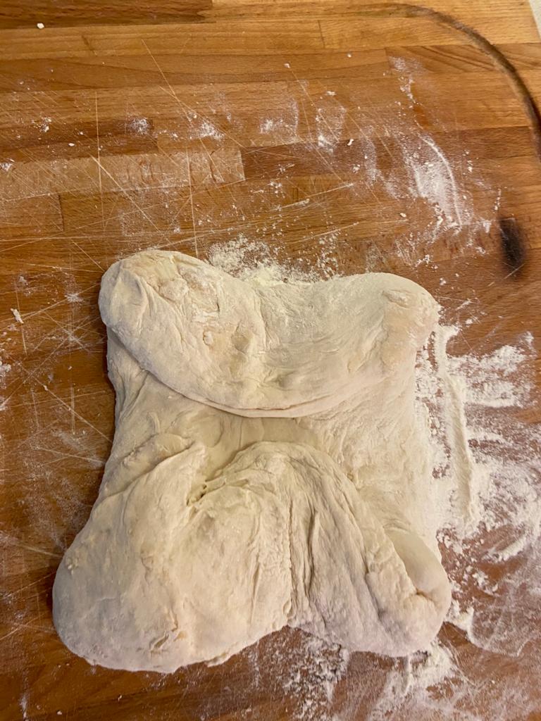 Passato questo tempo, trasferite l’impasto in una spianatoia per fare 4 pieghe a croce, tirando l’impasto verso l’esterno per poi chiuderlo.