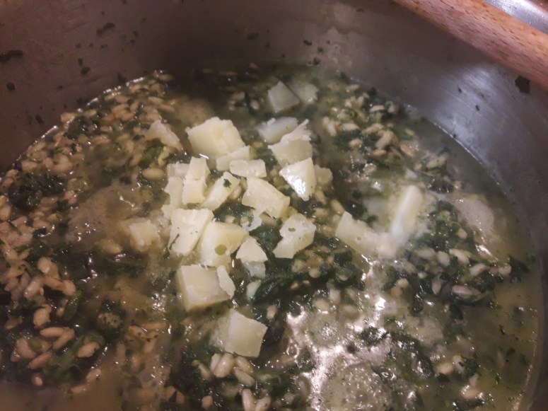 Dopo 5 minuti potete aggiungere le foglie di ortica, sminuzzate con un coltello o frullate se preferite un colore più uniforme del risotto.
