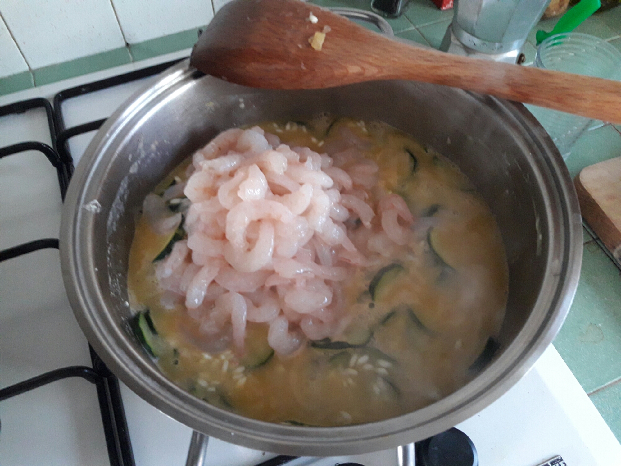 Dopo una decina di minuti aggiungete il merluzzo, fatelo insaporire un po’, quindi é il turno di pannocchie e scampi. Mescolando delicatamente, coprite tutto con il fumetto filtrato e, dopo qualche minuto, inserite le mazzancolle.