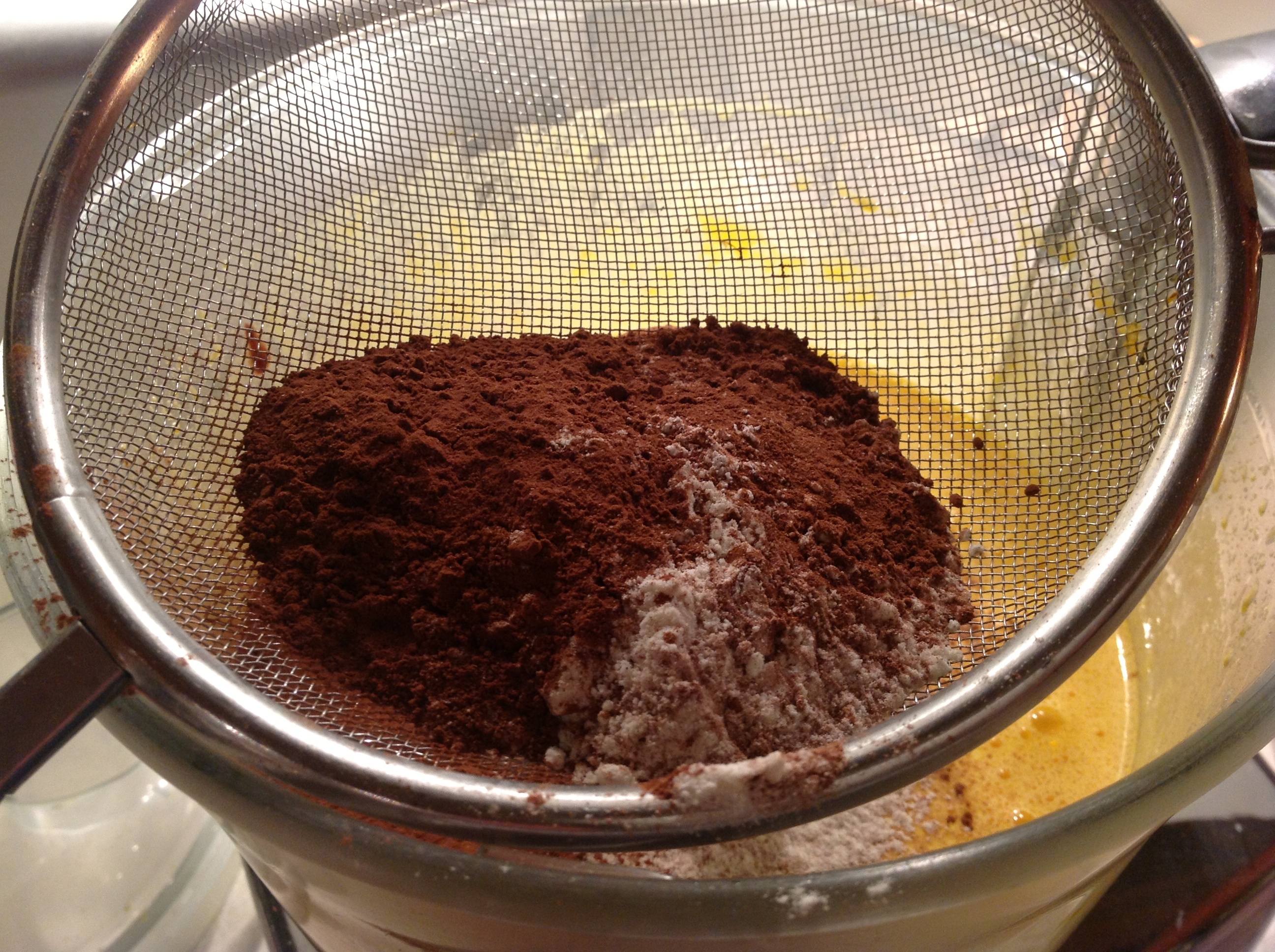 Setacciate la farina con il cacao, il lievito e il bicarbonato.